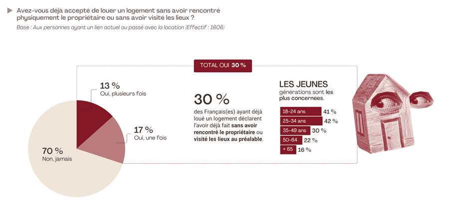Dans un contexte de tension locative, la précipitation peut parfois l’emporter sur la prudence. Ainsi, près d’un tiers (30 %) des personnes ayant un lien avec la location admettent avoir déjà accepté de louer un logement sans avoir rencontré physiquement le propriétaire ni visité les lieux au préalable. Un choix potentiellement risqué, que les jeunes générations semblent assumer bien plus facilement que leurs aînés : 41 % des 18-24 ans et 42 % des 25-34 ans déclarent avoir franchi ce pas, contre seulement 16 % des plus de 65 ans. Il est vrai que les moyens mis aujourd’hui à leur disposition – visites virtuelles, photographies et vidéos en ligne par exemple – facilitent grandement une prise d’informations bien plus compliquée que par le passé.