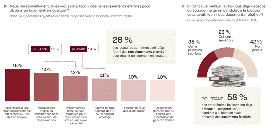 La pression du marché locatif pousse parfois les candidats à franchir la ligne rouge. Un quart (26 %) reconnaît avoir déjà fourni des renseignements erronés pour maximiser leurs chances d’obtenir un logement. Les manipulations les plus fréquentes restent d’ordre déclaratif : faire croire à une situation personnelle différente (16 %), dissimuler son origine (14 %) ou encore enjoliver ses revenus à travers une fiche de paie trafiquée (12 %). D’autres vont plus loin en falsifiant un contrat de travail ou un avis d’imposition, ou encore en inventant un garant fictif, des pratiques qui, bien que minoritaires (10 % des personnes interrogées), illustrent les stratégies de contournement alimentées par la tension du marché. Les plus jeunes sont davantage concernés : chez les 18-24 ans, ils sont 21 % à avoir présenté une fiche de paie surévaluée et 19 % à avoir fourni un faux contrat.